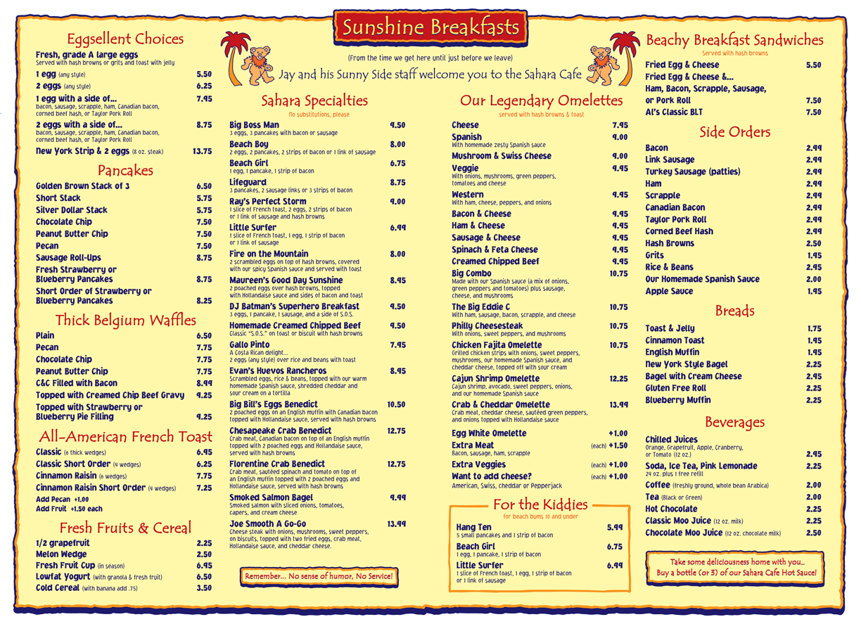 Sahara Cafe is a laid-back brunch spot located on North Baltimore Avenue. It's open Monday through Thursday from 7:00 AM to 12:30 PM, Friday until 1:00 PM, and Saturday and Sunday from 7:00 AM to 1:30 PM.